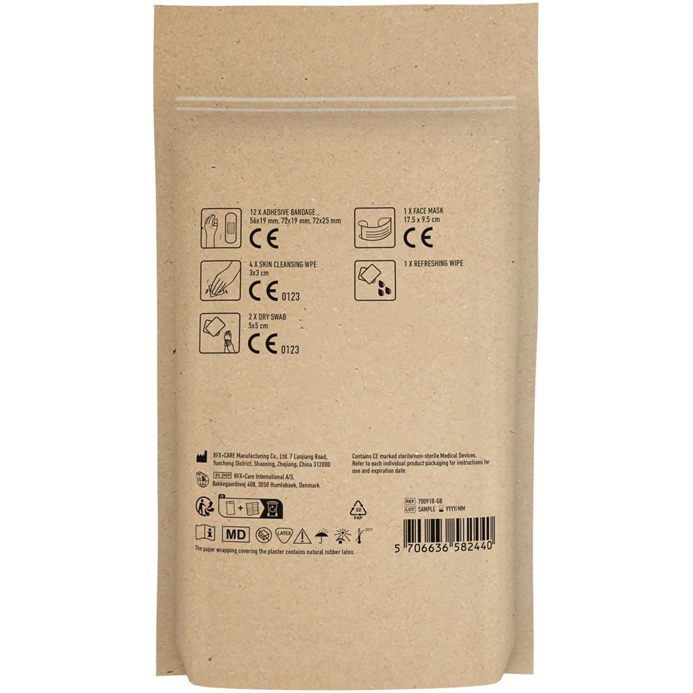 Dieses Set sollte in jedem Büro vorhanden sein, um auf kleinere Unfälle oder Verletzungen vorbereitet zu sein. Inhalt: 12 waschbeständige Pflaster, 2 trockene Tupfer, 1 Gesichtsmaske, 1 Erfrischungstuch und 4 Hautreinigungstupfer. Alle in diesem Set enthaltenen Erste-Hilfe- und Pflegeprodukte entsprechen den geltenden EU-Vorschriften. Der Preis beinhaltet einen Vollfarbdruck. In einer Papiertasche verpackt.